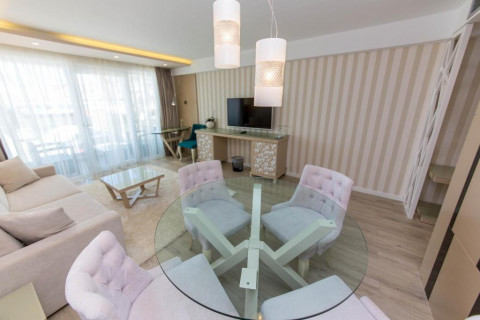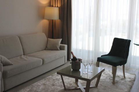 DELUXE SUITE room, близько 78 м², покращений двокімнатний номер з частковим видом на море (Partial SV). Розділений на спальню і вітальню. У спальні - 1 двоспальне ліжко розміру King size, у вітальні - диван (може бути використаний, як спальне місце для одного дорослого або двох дітей). Всього 1 номер в готелі.