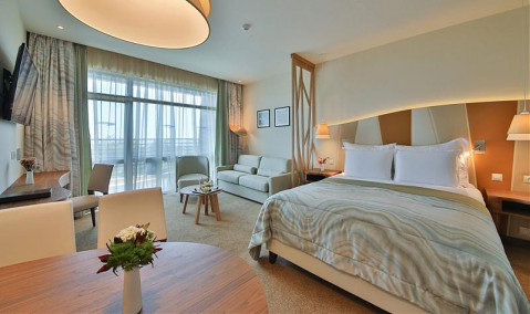 STUDIO DELUXE - з видом на море або басейном. Кількість ліжок: 2 ліжка 100 / 200см., 1 розкладний 2-х місцевий диван, ванна кімната з ванною і душ кабіною, окремий туалет, кондиціонер, халати і тапочки; кухонне обладнання з приладдям і мікрохвильовою піччю, балкон з лежаками і столом; макс.2в. + 2р., 3в .; 50м2.