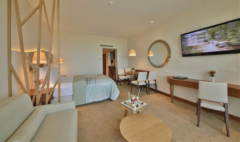 STANDARD STUDIO - з видом на море або басейн. Кількість ліжок: одне ліжко друга ліжко 100 / 200см., 1 розкладний 2-х місцевий диван; міні-кухня; ванна кімната з ванною і душ кабіною; халати і тапочки, макс.2в. + 2р.,.; 50м2.