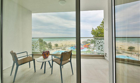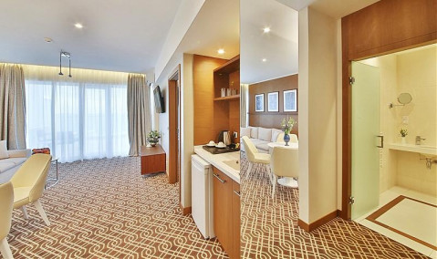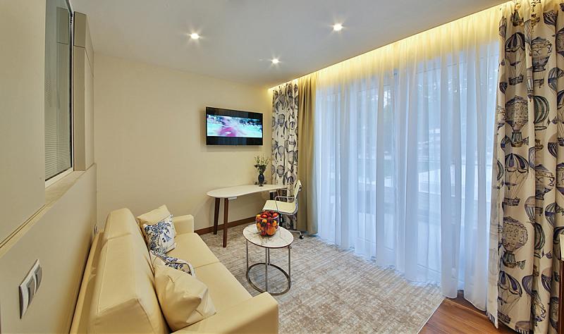 APP DELUXE SV / PV: спальня + хол з гостинним куточком; два ліжка 100 x 200 см. (26 см. французький матрац), розкладний диван (160 x 180 см., 14 см. матрац), LED телевізор (49 '') Sat TV, стіл і стілець, набір чаю-кави в номері , сейф, прасувальна дошка з праскою, телефон, інтернет, міні бар (за дод. плату); високого класу французькі подушки і ковдри, розкішна постільна білизна та халати; ванна кімната (душ, ванна, окремий туалет), 22 '' LED телевізор і супутникове телебачення 7,5м2; туалет 1,5м2; балкон 7м2; загальна розмір номера 35м2