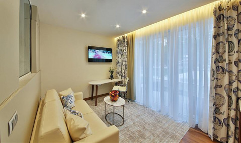 STUDIO DELUXE SV: спальня з гостинним куточком і міні кухнею; два ліжка 100 x 200 см. (26 см. Французький матрац), розкладний диван (160 x 180 см., 14 см. матрац), LED телевізора (49 '') Sat TV, стіл і стілець, набір чаю-кави в номері , сейф, прасувальна дошка з праскою, телефон, інтернет, міні бар (за дод. плату); високого класу французькі подушки і ковдри, розкішна постільна білизна та халати; кухня: раковина, холодильник, керамічна плита; ванна кімната (душ, ванна, туалет), 22 '' LED телевізор і супутникове телебачення; 8м2; туалет 1,5м2; балкон 7м2; загальна площа студіо 47м2