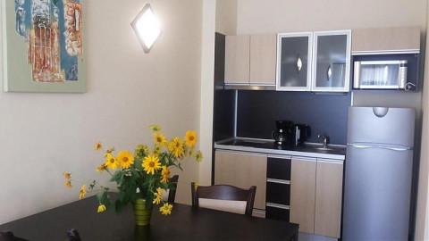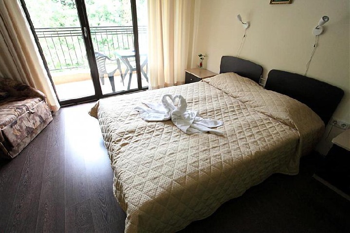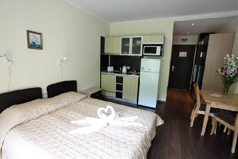 1 BEDROOM APARTMENT: 2 приміщення, двері між кімнатами, два односпальні ліжка, спалні, двуйхместний розкладний диван; 1 ванна кімната з душем; макс.2в. + 2р., 3в. + 1р., 4взр., 55-68м2, вид на парк або на море;