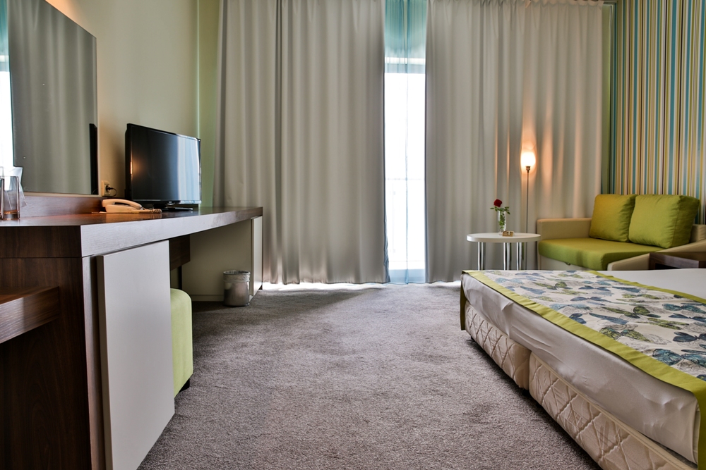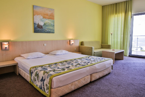 DBL SUPERIOR: 1 двоспальне ліжко, розкладний диван, 1 ванна кімната (з ванною або душем); макс.2в. + 2д., 3в., 26м2; з боковим видом на море;