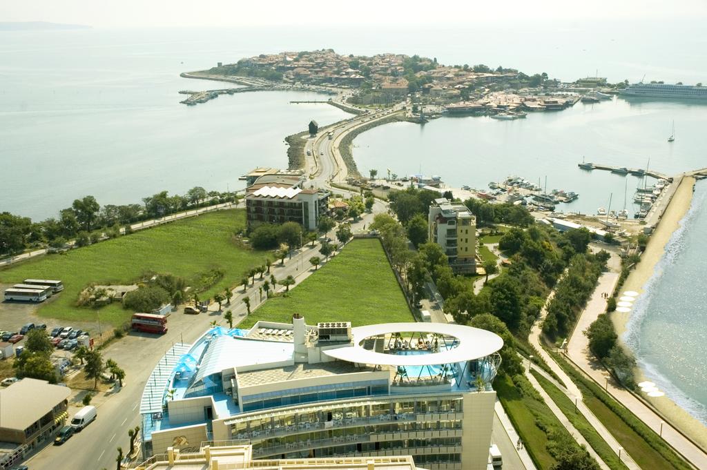Між старовинної і новою частиною міста Несебра, в 50м. від дикого пляжу внизу перед готелем і в 300 м. від піщаного пляжу. 128 номерів.