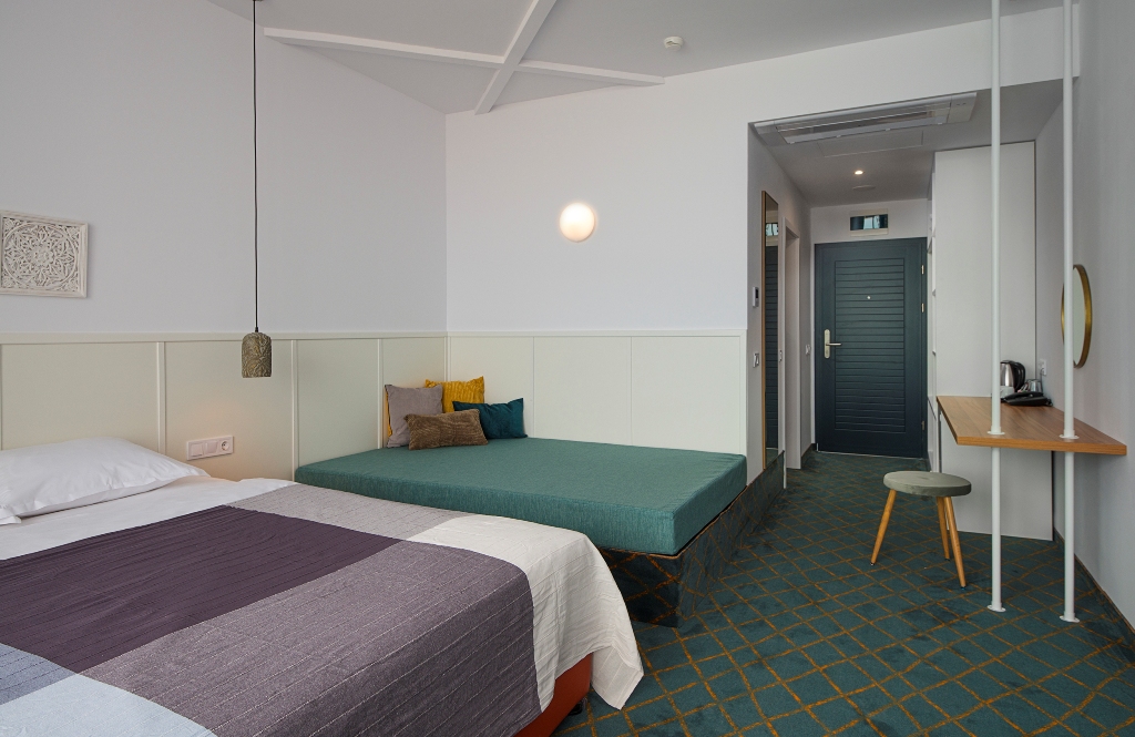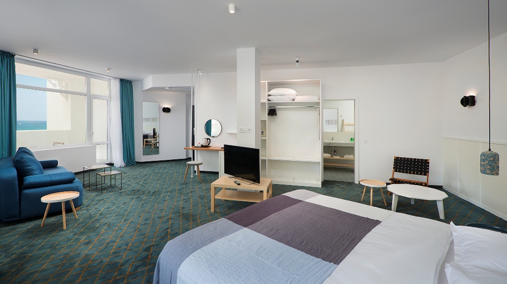 SUITE: 2две зони (вітальня і спальна зона), 1 звичайне ліжко (1 двоспальне ліжко) і один розкладний диван (підходить для 2 дітей або одного дорослого), ванна кімната з душем, додатковий туалет; 2в. + 2р., 3в .; 50м2;