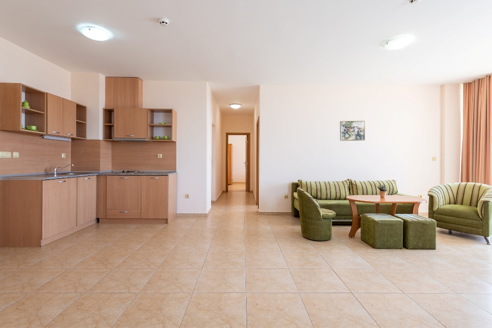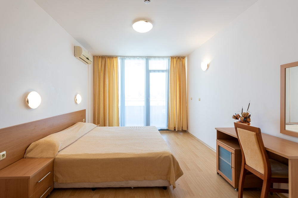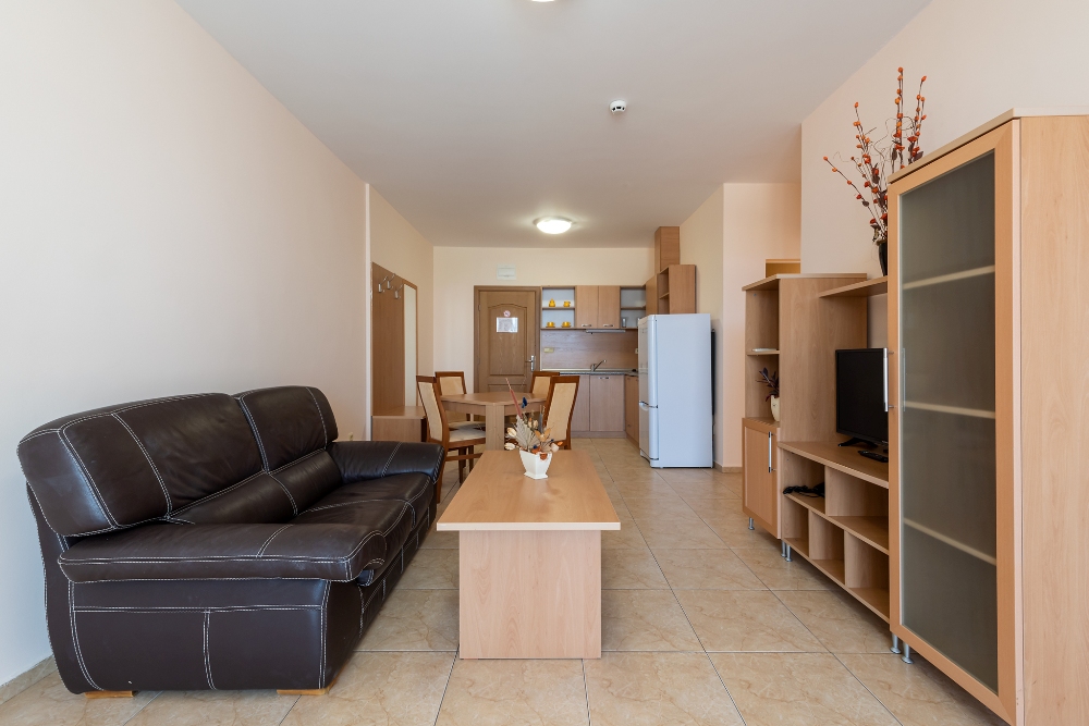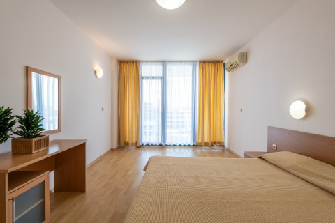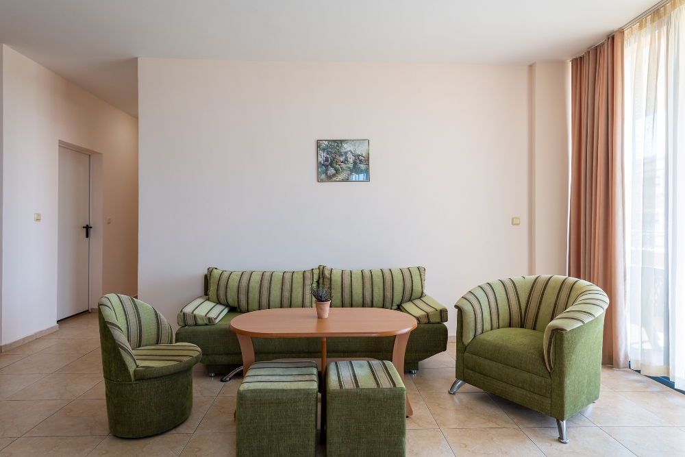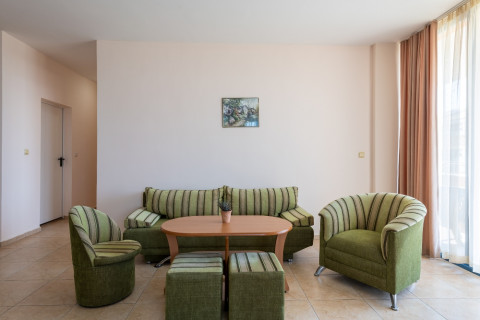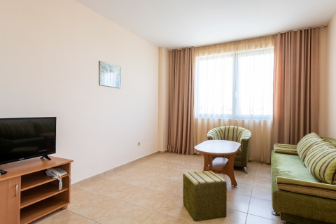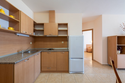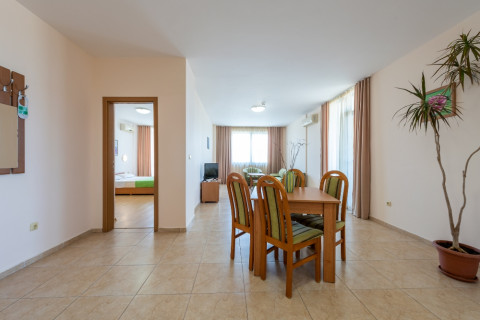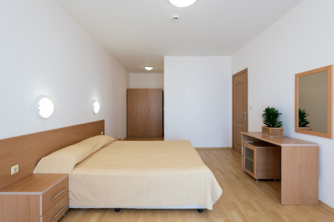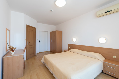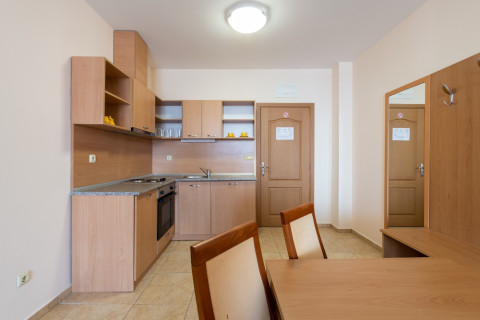 APARTMENT TYPE A: 2 приміщення, двері між кімнатами, 1 двоспальне ліжко, розкладний диван; кухонний куточок з обладнанням: плита, ел.чайник / за запитом /; 1 ванна кімната з ванною і 1 туалет; макс.2в. + 2р., 3в. + 1р., 4взр .;