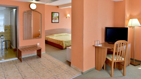 APARTMENT: 1 кімната / без дверей між кімнатами /, в спальні: 1 двоспальне ліжко, у вітальні: раскл.діван, 1 ванна кімната з душем; макс.2в. + 2р., 4в., 45м2.