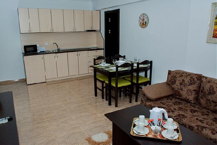 2 BEDROOM APARTMENT: 2 приміщення: вітальня з диваном і кухонним куточком з обладнанням / плита, ел.чайник, мікрохвильовка, пральна машина /; спальня з двома односпальними ліжками, 2 ванні кімнати з душем, 2 туалети; макс. 4в. + 2р., 5в., 80м2;