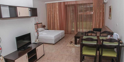 В 300м. від берега моря. 70 номерів / 10 студиа, 50 апартаментів з 1 спальні, 10 апартаментів з 2-ма спальнями /.