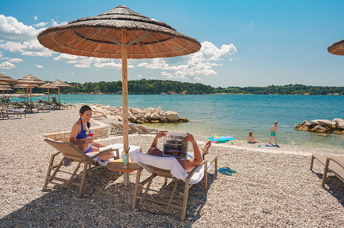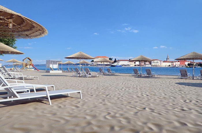 Піщаний пляж Val Maro Sandy Family в 50 метрах від готелю - унікальний пляж на острові, нагороджений «Блакитним прапором» в 50 м від готелю, парасольки і шезлонги - безкоштовно; пляж Val Parenzo Family знаходиться в 50 м на північний захід від готелю Valamar Isabella, частина пляжу мощена, а частина скеляста з драбинами і ступенями для входу в море, парасольки і шезлонги - безкоштовно; пляж Sunset unset (тільки для гостей для гостей V Level) в північно-західній частині острова, природно трав'янистий або скелястий пляж з брукованими плато, на яких встановлені шезлонги, парасольки (безкоштовно для гостей V Level), балдахін для двох і крісла orbit-lounge (за додаткову плату); гальковий пляж Val Riviera Relax - тільки для дорослих, знаходиться в 150 метрах на південний схід від готелю Valamar Isabella, з спуском до моря, також тут є місця з трав'яним покриттям в тіні сосен і дубів, лежаки і парасольки (безкоштовно); кам'янистий і мощений пляж Val Miramare V Level Relax - для пар, зарезервовані місця з шезлонгами і парасольками - тільки для гостей V Level; гальковий і трав'яний пляжі Val Sunrise Family і Barbaran Beach - лежаки і парасольки - за додаткову плату.
