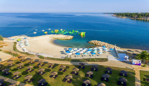 Платформа, галька і камінь, є насипний піщаний пляж з трав'яними та брукованими галявини для засмаги - в 80-150 метрах від готелю. парасольки і шезлонги - за додаткову плату; душ і кабінки для переодягання на пляжі.