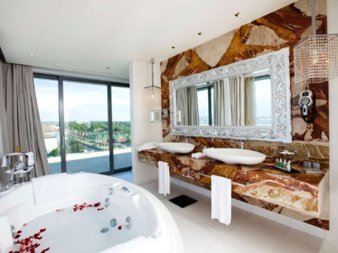 1 номер Presidential Suite Jure Grando (263 кв. М + 548 кв. М балкон, номер в чорних тонах на останньому поверсі, спальня, простора вітальня з каміном, їдальня та кухонний зони, джакузі на терасі, вид на море)