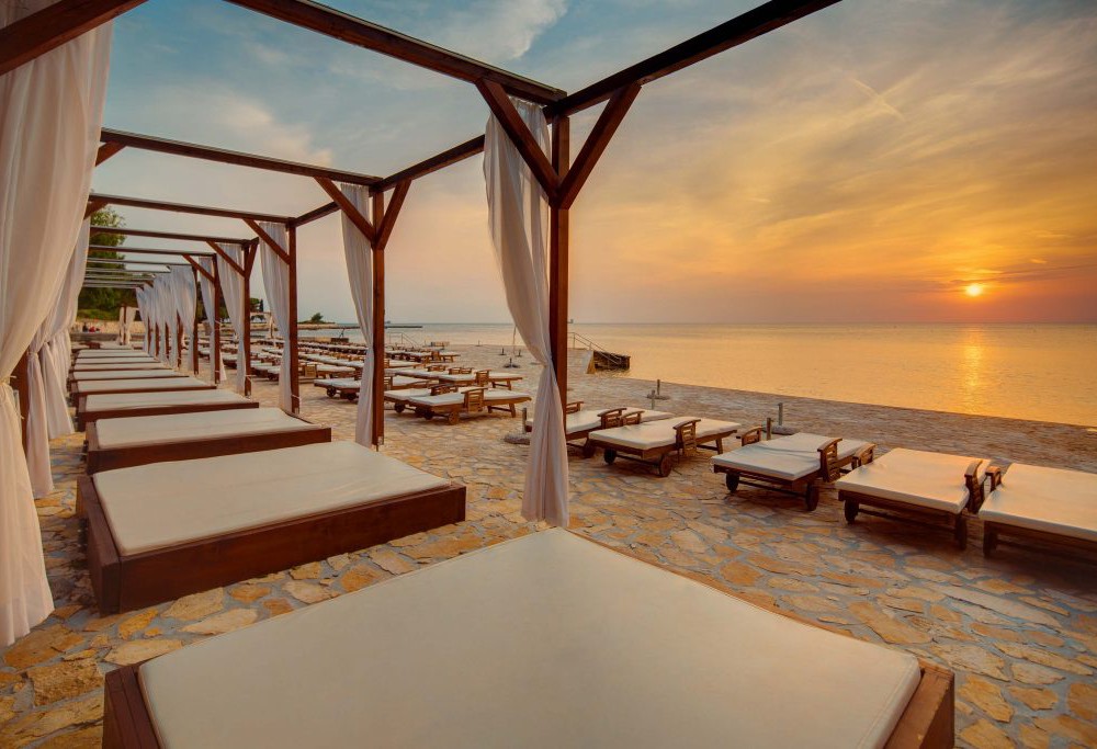 У 50 м від готелю, широка бетонна плита і камінь, вхід в море на глибину по драбинках, багато зелених галявин для засмаги з гамаками, тенти з балдахіном, парасольки і лежаки - безкоштовно в лаундж-зоні, рушники - під депозит. Пляж готелю був нагороджений "Блакитним прапором". У 2017 був повністю відремонтований: пляж викладений каменем і покритий галькою, оновлені точки доступу в море. Доступ до моря також був пристосований для людей з обмеженими можливостями.