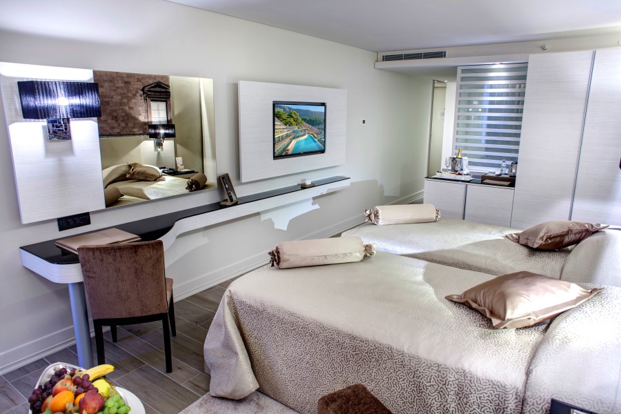 1 номер Presidential Suite (180 кв.м, просторий президентський люкс, що включає спальню, їдальню і кухню, кімнату для переговорів, фінську сауну і джакузі, з захоплюючим видом на Адріатичне море)