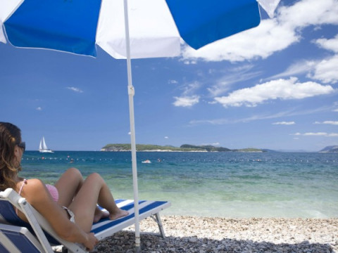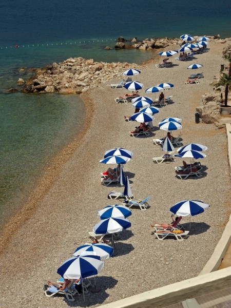 Пляж - платформа і галька, лежаки і парасольки - безкоштовно - для гостей готелю, лежаки з навісом - за додаткову плату