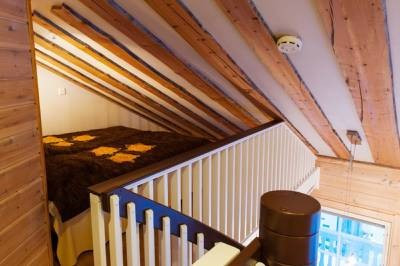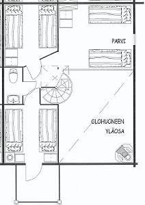 На верхньому поверсі 2 спальні з двома окремими ліжками в кожній (в одній спальні невеликий вентиляційний балкон, інша спальня без вікна), на невеликому лофт (скошена стеля) 2 окремих ліжка, роздільний санвузол.