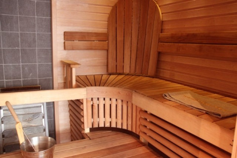 Верхній поверх 47,5м²: кімната з каміном, 2 спальні, туалет, ванна кімната і сауна. З ванної кімнати вхід на маленький балкон, з кімнати з каміном вхід на великий балкон.