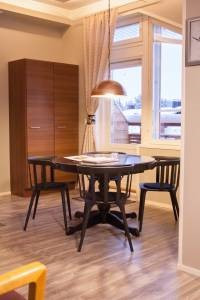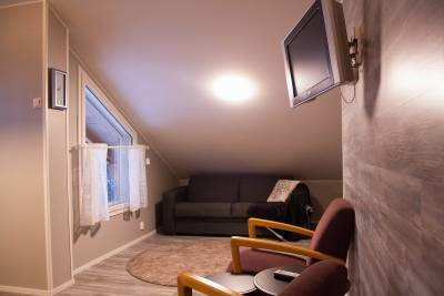 Апартаменти-студія: одне велике ліжко і розкладний диван, міні-кухня, сауна, душова кімната, туалет, балкон.