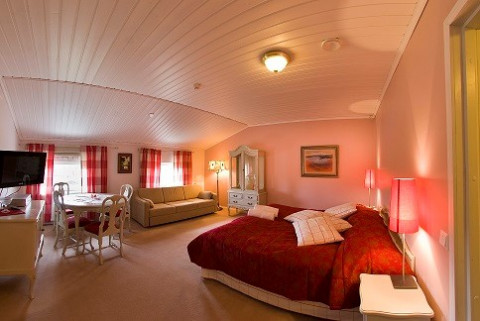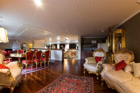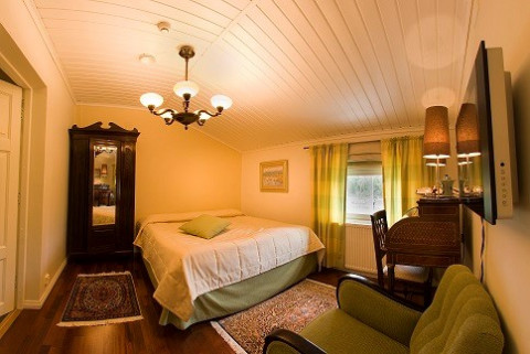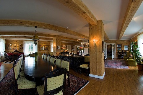 Через двері вітальні Ви потрапляєте в Дзеркальний кімнату з видом на замерзлу річку. Тут можна провести нараду або вечерю великою дружною компанією. Стіл призначений для 26 осіб. Унікальність кімнати додає гарний порцеляновий камін.