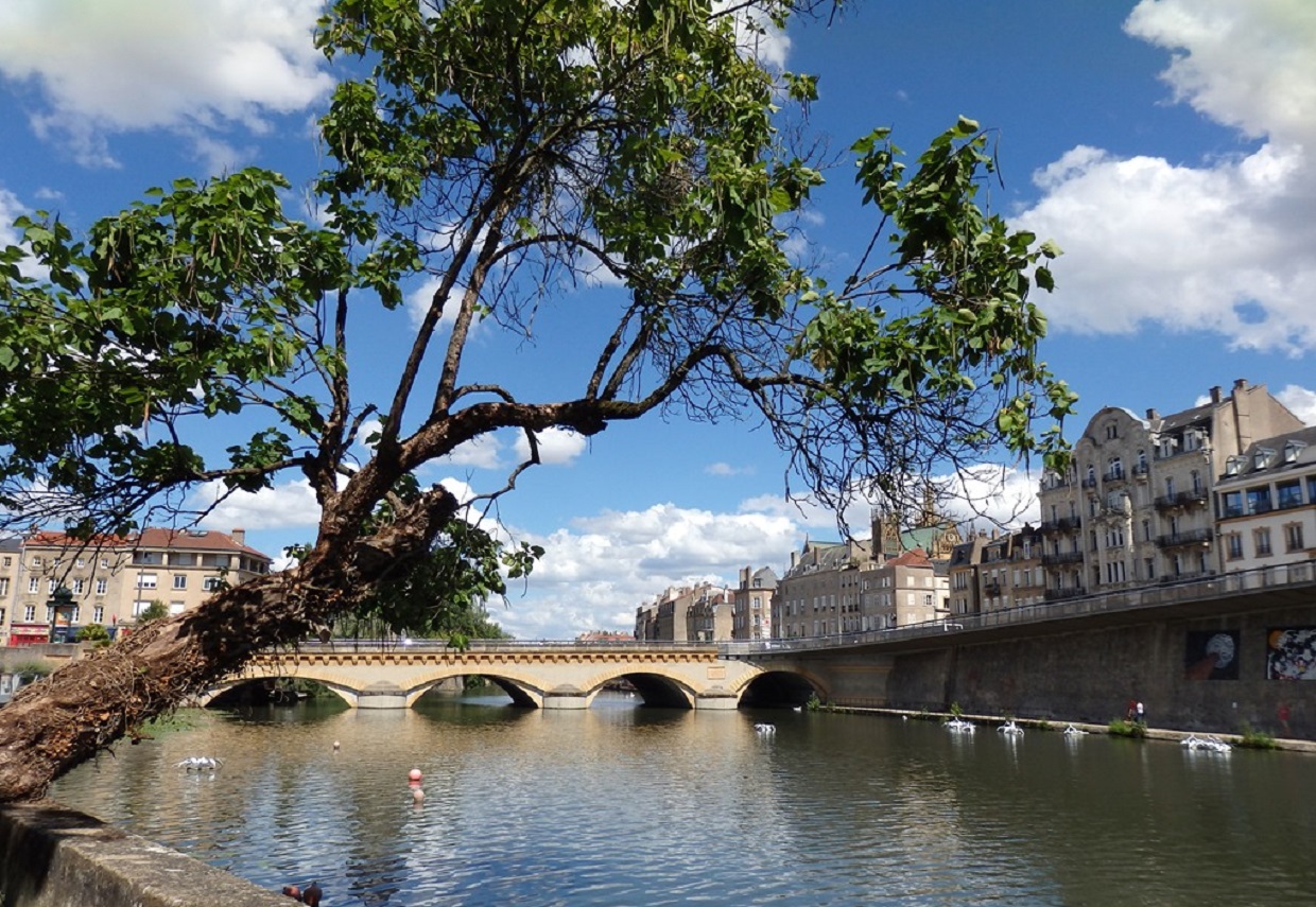Площа Республіки - основна паркова зона, в східній частині якої знаходиться велика кількість магазинів і кафе, армійські бараки на півдні і офіційні сади еспланади, з видом на Мозель на заході. Справа, знаходиться красивий класичний Палац правосуддя, побудований з характерного для міста жовтого каменю. Ліворуч мощена гравієм дорога веде повз старовинний арсенал, який зараз перероблений в престижний концертний зал архітектором постмодернізму Рікардо Бофілем. Будівля арсеналу тягнеться до церкви Сен-Пьєр-о-Ненне, що претендує на звання однієї з найстаріших церков у Франції. Поруч знаходиться інша історична будівля - каплиця Тамплієрів XIII століття.