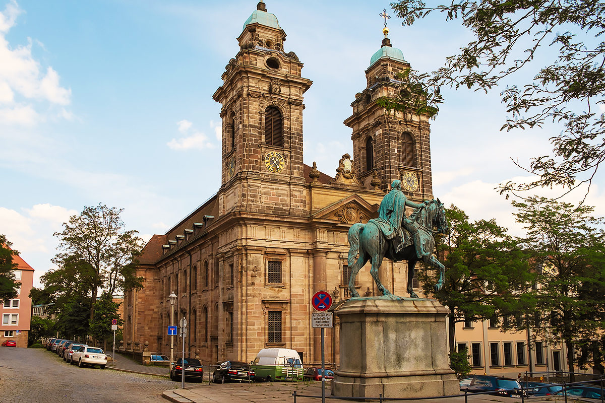 Основні пам'ятки Нюрнберга, такі як церкву Себальда і церкву Кларакирхе, фонтан Шлюбна карусель, стара Ратуша Нюрнберга, міст ката (за легендою на нього приходили близькі засуджених на страту і просили убити своїх рідних швидко і безболісно), Ринкова площа, середньовічний госпіталь, в якому 350 років зберігалася корона "священної римської імперії" і звичайно візитна картка Нюрнберга, знаменитий фонтан XIV століття "Шенер брюннен". Покритий золотом фонтан прикрашають 40 фігур, що стоять один над одним на чотирьох рівнях. Причиною популярності цього фонтану є кільце, вставлене в красиві грати. Досі не можуть зрозуміти, яким чином це було зроблено. За легендою, одна молода людина, що була підмайстром у слюсаря і що бажав одружуватися на дочці свого хазяїна, вставила це кільце за одну ніч, чим справив незабутнє враження на кохану і на її батька. Відтоді жителі міста і туристи доторкаються до цього кільця і загадують бажання. Загадайте бажання і три рази покрутите кільце: ваше бажання виконається обов'язково. Тільки є один секрет. Насправді кілець два, одно мідне, інше залізне. Залізне потрібно шукати. Корінні нюрнбержцы упевнені: справжнє чарівне кільце - чорне, залізне, а блискуче мідне - просто приманка для туристів.