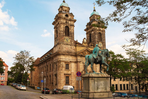 Нюрнбергу належить найбільша готична церковна будівля в Німеччині - церква Святого Лаврентія. Вона була побудована в 1260 році на місці древньої романської базиліки. Між двома раннеготическими вежами можна бачити чудове вітражне вікно - "троянду", що має в діаметрі 9 метрів. Під час Другої світової війни вдалося зберегти церковні скарби, помістивши їх в підвалах міста. Будівля ж була повністю зруйнована. Його відновили в первозданному виді в 1952 році. У хорі церкви знаходяться три шедеври: дарохранителька, позолочений канделябр і скульптура "Вітання ангела" Фейта Штосса. Над хорами - прекрасні вітражі: імператорський вітраж 1477 року і вітраж Фолькламер.