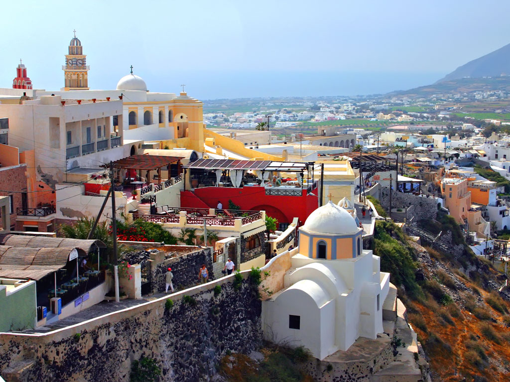 Вузенькі вулички Фіри, численні арки, затишні будиночки місцевих жителів - турист точно залишиться під приємним враженням від прогулянки. Особливої уваги заслуговує відкривається звідси вид: безкрає море, що йде далеко за горизонт, скелясті острови чорного кольору (Каменес), доїхати до яких можна на катері, – пейзаж ніби написаний щедрим художником.