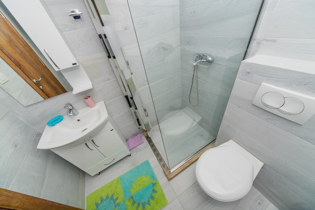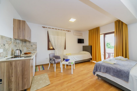 В STUD 03 sv: французьке та додаткове ліжка, обладнана кухня, кондиціонер, супутникове ТБ, Wi Fi інтернет, санвузол з душовою кабіною, великий балкон з видом на море. № 7,11. Максимальне розміщення: 3 чол.
