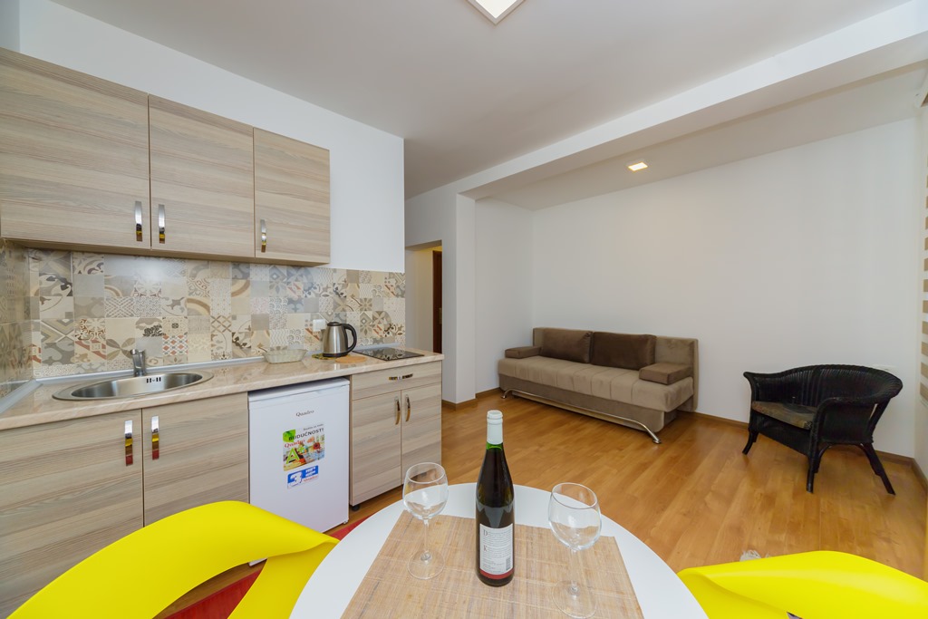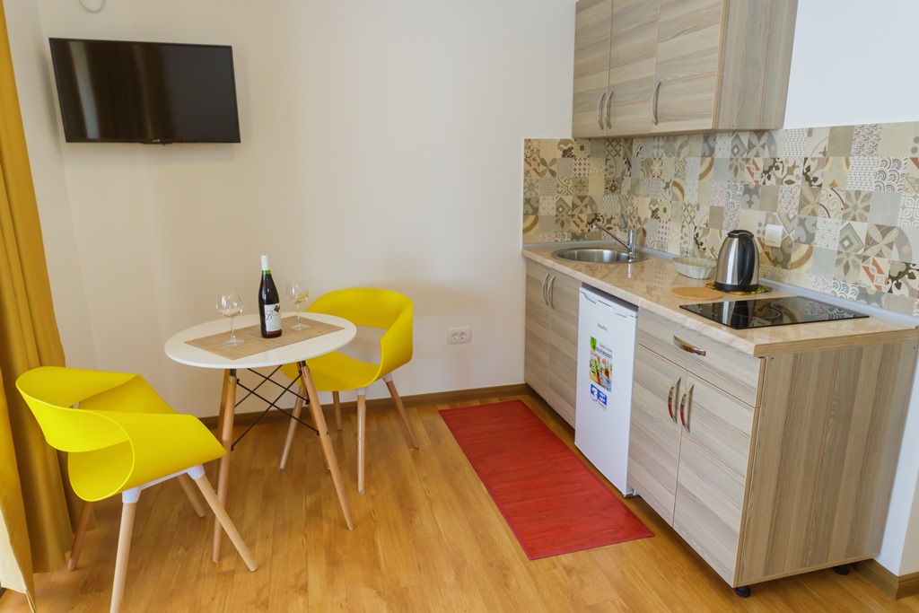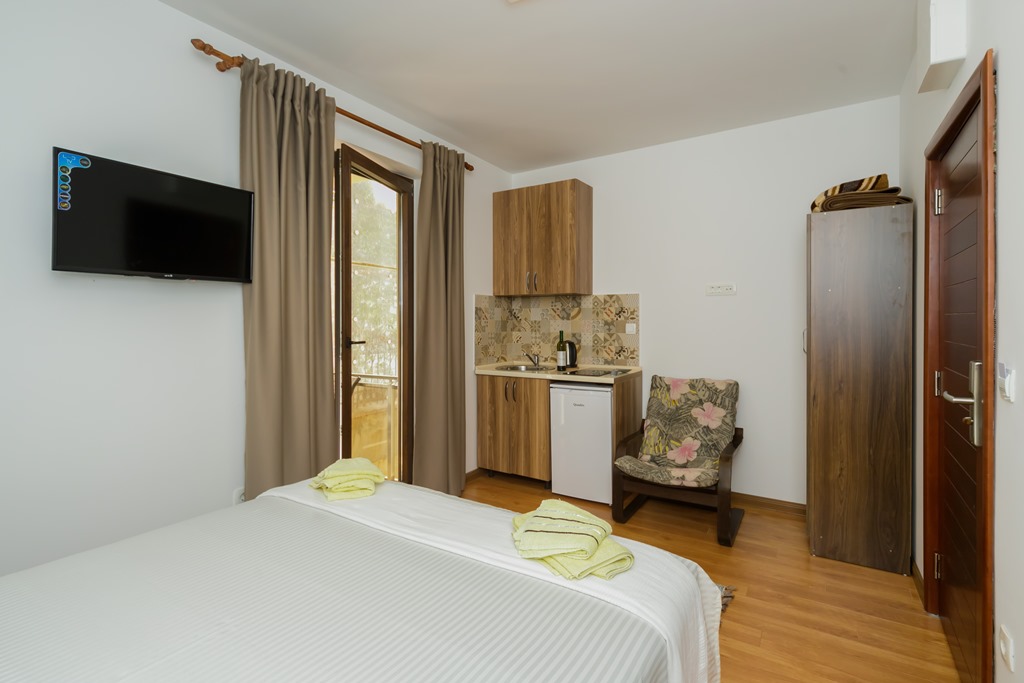 В STUD 02 ssv: французьке ліжко, кухонний куточок, кондиціонер, супутникове ТБ, Wi Fi інтернет, санвузол з душовою кабіною, балкон з частковим видом на море. №1, 2, 8, 9. Максимальне розміщення: 2 чол.