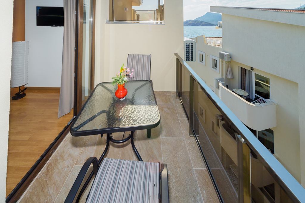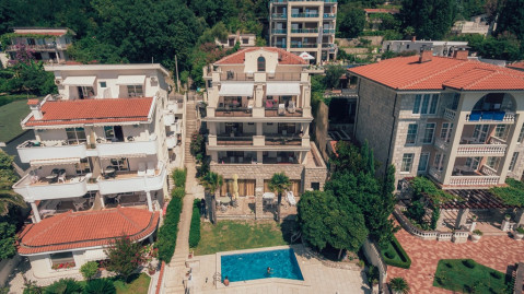 Сучасна будівля, простора тераса з прекрасним видом на море.