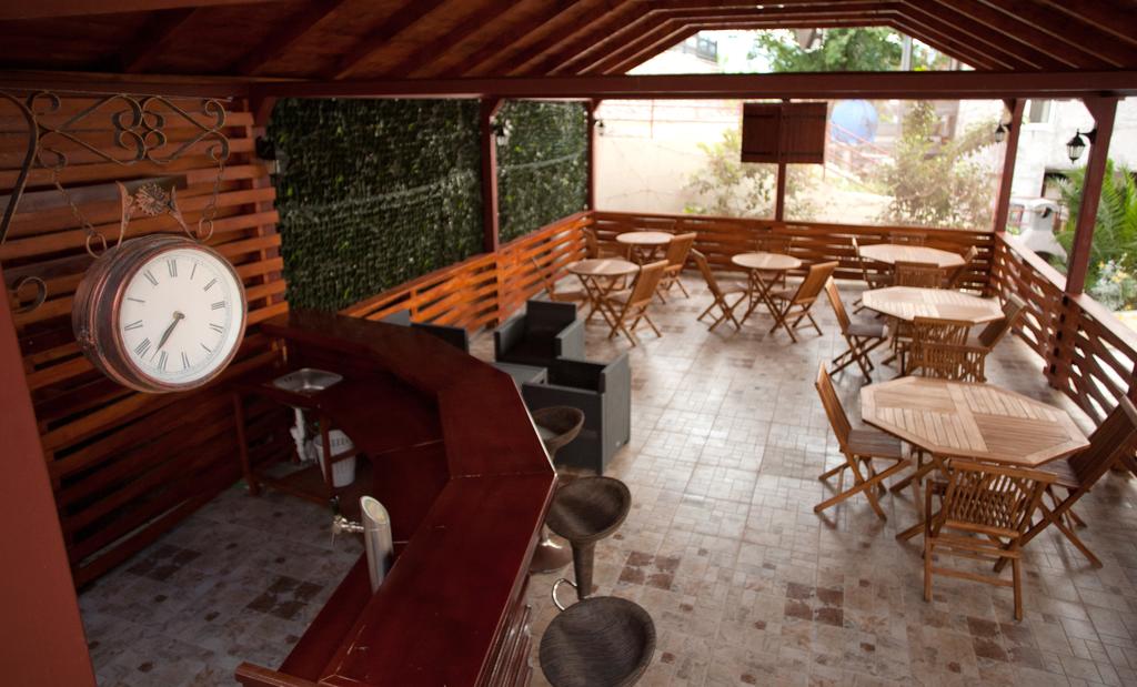 Сучасний п'ятиповерховий будинок з кафе і власним паркінгом, оточений садом, дитячий ігровий майданчик у дворі і невеликий нестаціонарний басейн.