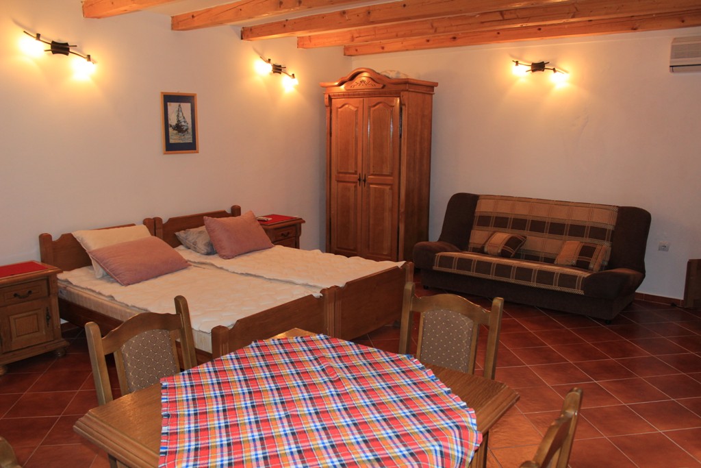 В STUD: Простора кімната з французьким ліжком, розкладним диваном і кухнею. Кондиціонер, кабельне телебачення, холодильник, набір необхідного посуду, ванна кімната, тераса перед входом. Максимальне розміщення - 4 чол.