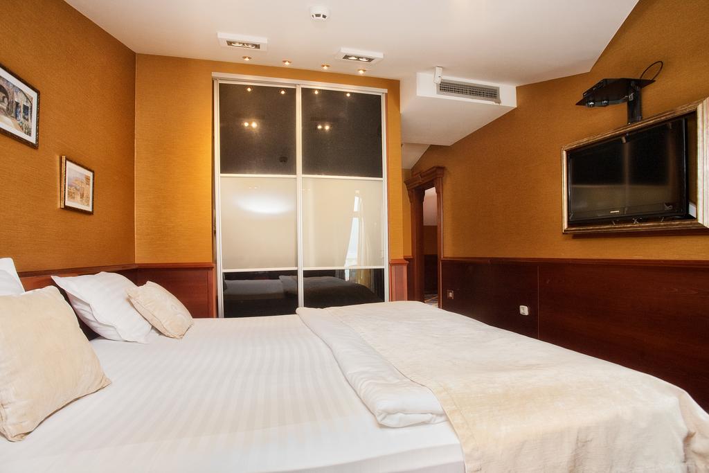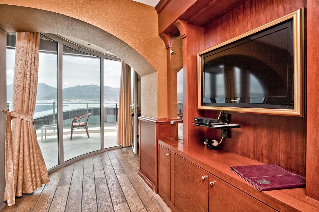 В JUNIOR SUITE №4: вітальня c диваном, спальня з французьким ліжком, кондиціонер, супутникове ТБ, Wi Fi інтернет, сейф, санвузол з душовою кабіною, вид на море. Площа номера 25 м2. Максимальне розміщення: 3 людини.