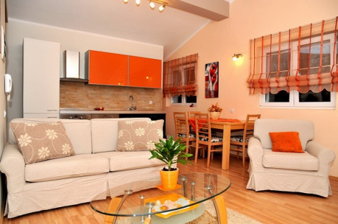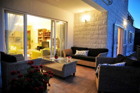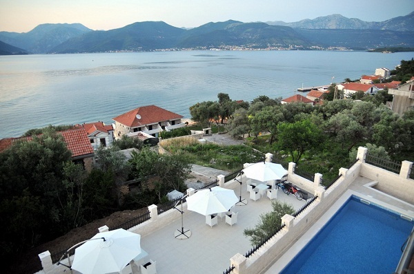 В апартаменті: Розташований на першому поверсі з видом на Боко-Которську затоку. Має два входи, один з двору і окремо з боку тераси з басейном, двокімнатний, в спальні французьке ліжко, в залі диван, кухня, обідній стіл.