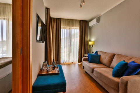 B Premium APP: в вітальні французьке ліжко, софа, зона відпочинку, в спальні французьке ліжко, кондиціонер, супутникове ТБ, Wi Fi інтернет, сейф, міні бар, апарат для приготування чаю і кави, санвузол з душовою кабіною, фен, тераса з видом на море. Максимальне розміщення: 4+1 чол. Площа: 70 м2.
