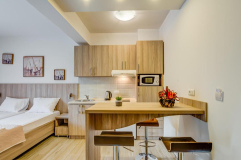 В Stud 02+1: французская кровать, раскладывающееся кресло, оборудованная кухня, кондиционер, спутниковое ТВ, Wi Fi интернет, фен, утюг, гладильная доска, санузел с душевой кабиной, балкон с видом на город. Максимальное размещение: 3 чел. Площадь: 30 м2.