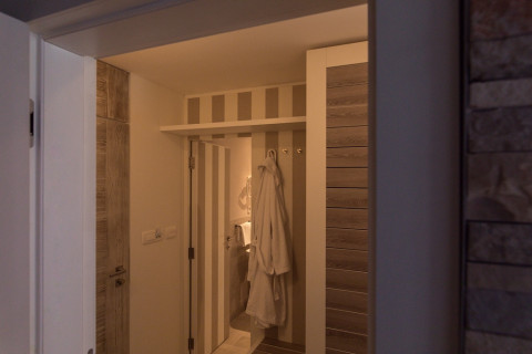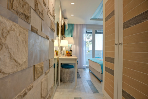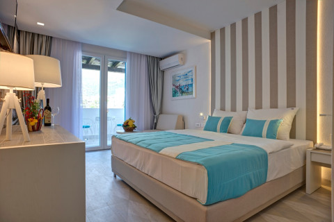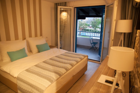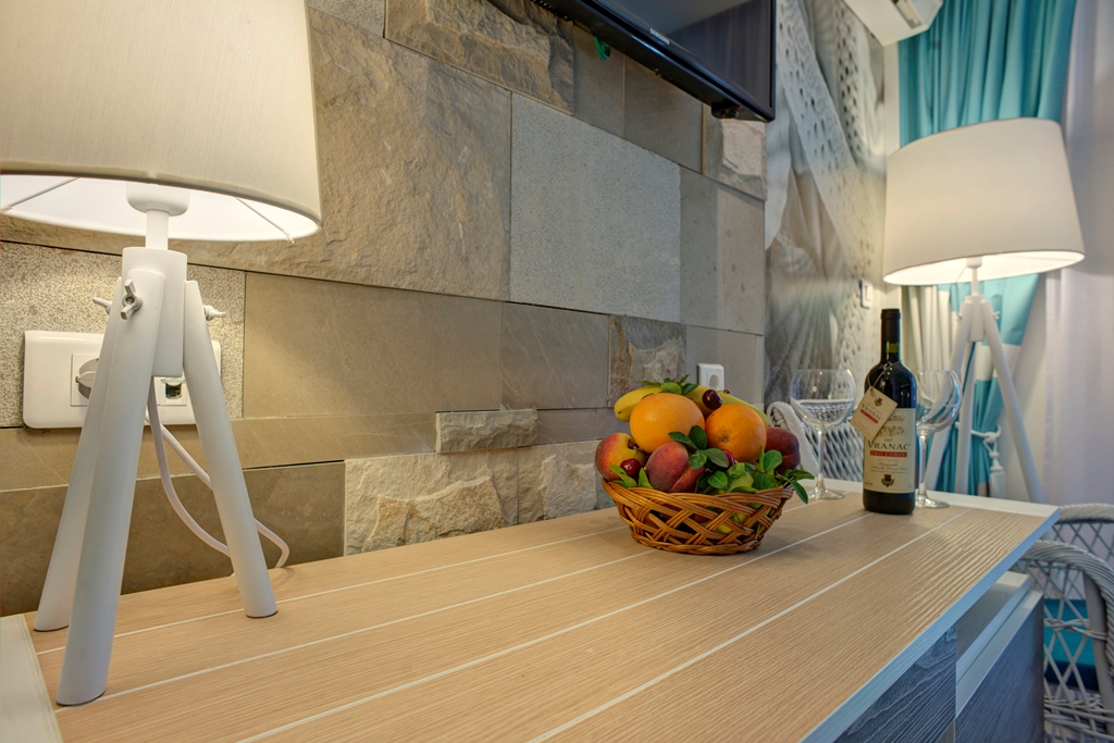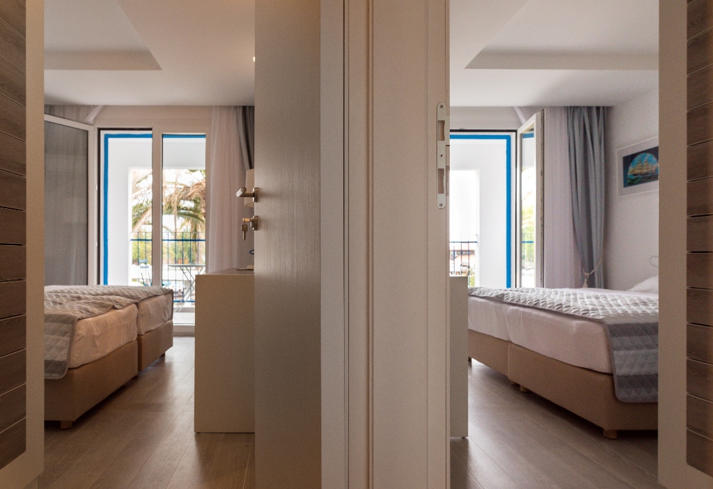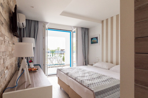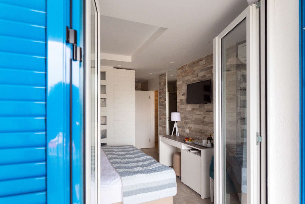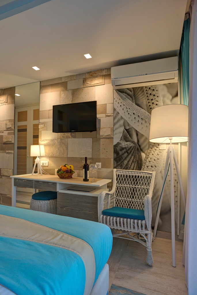 B APP 02: вітальня з диваном, спальня з французьким ліжком, кондиціонер, супутникове ТБ, Wi Fi інтернет, міні бар, сейф, санвузол з душовою кабіною, фен, чайник за запитом на рецепції готелю, балкон або тераса. Максимальне розміщення: 4 чол, мінімальне 2 дорослих.