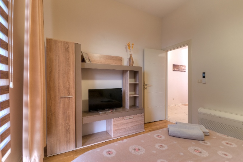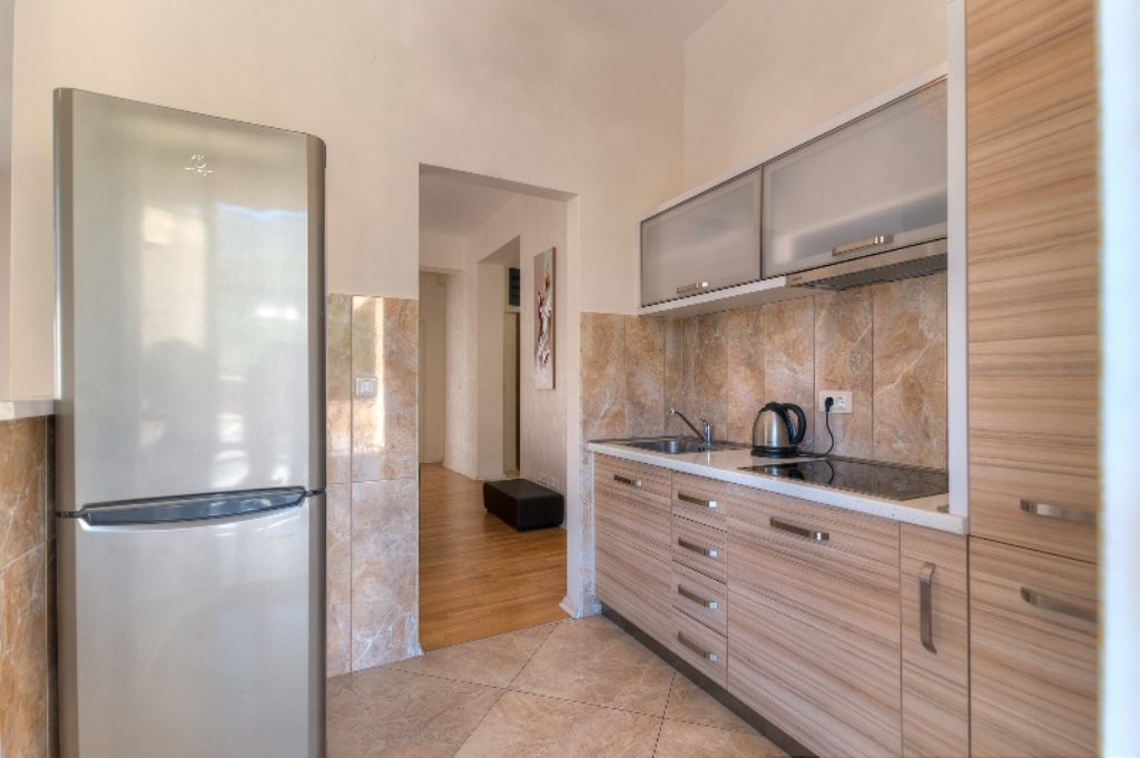 В SUP АРР SV, 2 BR: Площа: 85-90 м2. Вітальня з диваном, спальня з французьким ліжком і спальня з двома роздільними ліжками, міні кухня (електроплита, чайник, холодильник), кондиціонер, інтернет Wi Fi, широкоформатний ТВ, санвузол з душовою кабіною, пральна машина, тераса з видом на море. Максимальне розміщення: 6 дор.