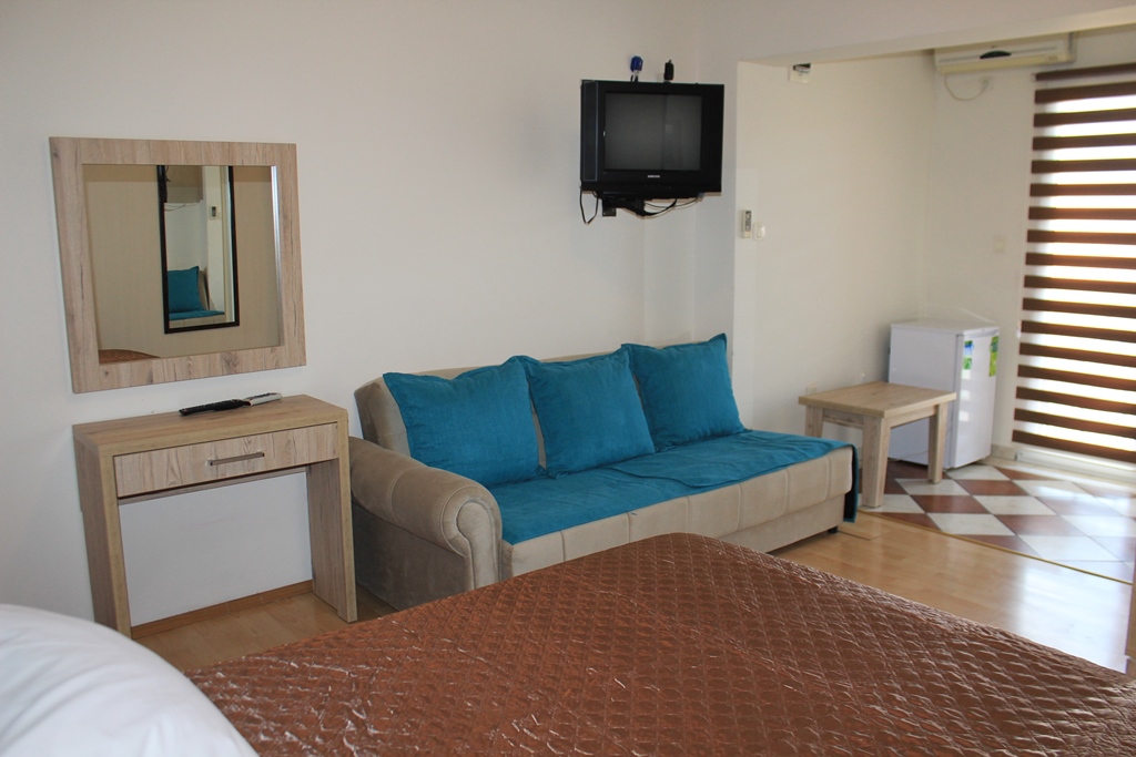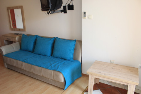 В APP: Спальня з французьким ліжком і вітальня з розкладним диваном, кондиціонер, кухонний блок з холодильником, обідній стіл, електрочайник, балкон з видом на море, кабельне телебачення, душ.