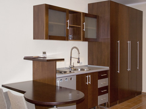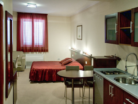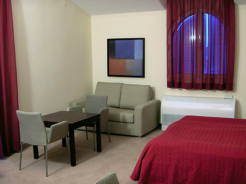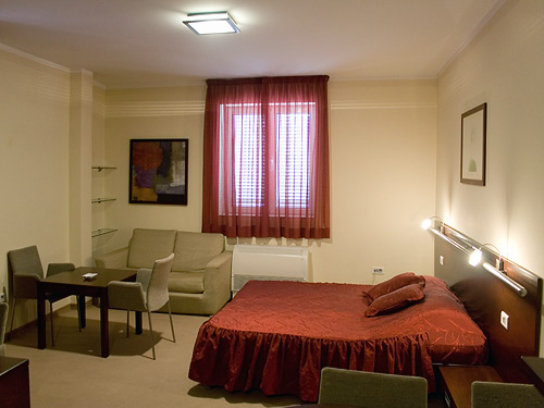 В APP: Велике приміщення, з виділенням вітальні та спальні зонами, двоспальне ліжко і вітальня зона з розкладним диваном, кондиціонер, холодильник, кухонний блок, кабельне телебачення, телефон, балкон, фен, душова кімната. Максимальне розміщення - 2 + 1 людина. Два номери мають кухню.