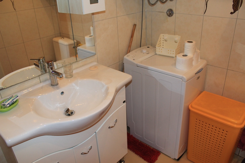 У ванній кімнаті-душова кабіна, пральна машина, фен.