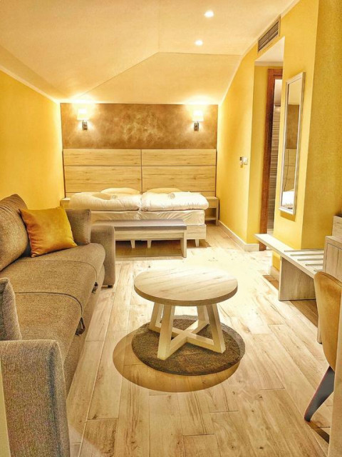 В DBL KING SUITE SV: велике французьке ліжко та розкладний диван, кондиціонер, супутникове ТБ, Wi Fi інтернет, міні бар, сейф, санвузол з душовою кабіною, фен, балкон з панорамним видом на Будву: гори, море, острів Святого Миколи. Площа: 30 м2. Макс розміщення: 2+2 чол.