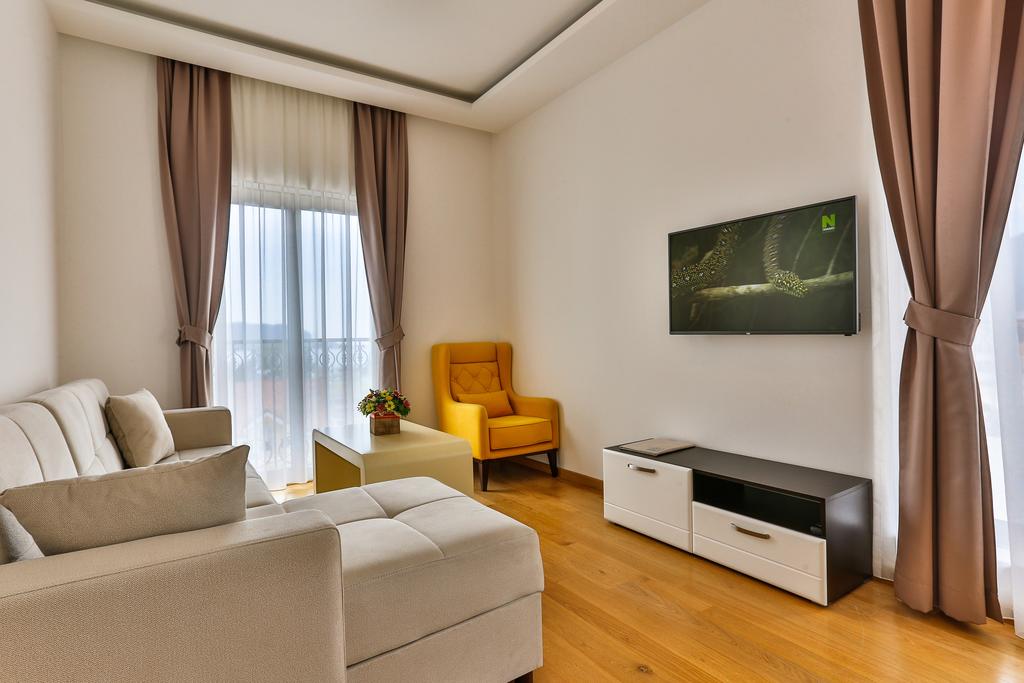 В Superior Suite SV: французьке ліжко, розкладна софа, кондиціонер, супутникове ТБ, Wi Fi інтернет, сейф, міні бар, санвузол з душовою кабіною, фен, тапочки, тераса з видом на море. Максимальне розміщення: 2 дор + 2 дит. Площа 55 м2.