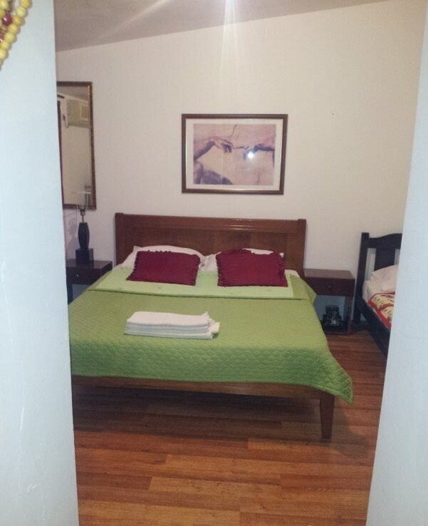 Квартира состоит из двух спален, в одной спальне французская кровать, в другой спальне три кровати, кухня, гостиная, стиральная машина, несколько ТВ.