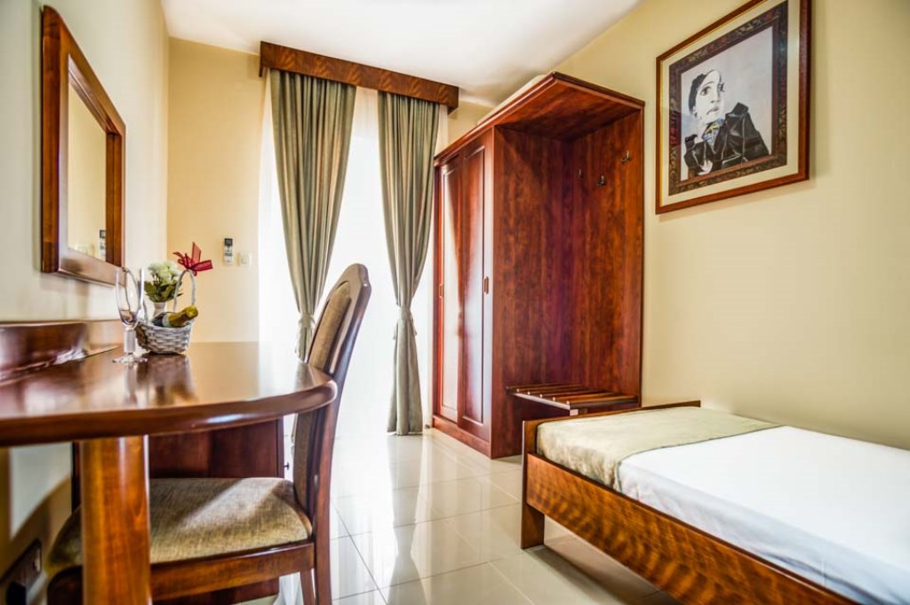 Одноместные номера: 4 одноместных номера , из них 2 с балконом (20 м2) и 2 без балкона (14 м2), с видом на горы или сад. Максимально допустимое размещение - 1 человек.