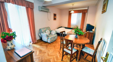 В АРР 04 LUX: номер знаходиться в новій частині будівлі, оформлений сучасно, французьке ліжко і дві софи, міні кухня, кондиціонер, супутникове ТБ, Wi Fi інтернет, санвузол з душовою кабіною, просторий балкон. Макс розміщення: 4 дор.