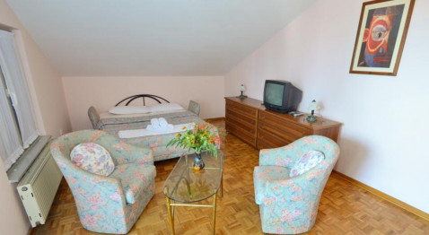 В STUD 03 LUX: номер знаходиться в новій частині будівлі, оформлений сучасно, французьке ліжко і софа, міні кухня, кондиціонер, супутникове ТБ, Wi Fi інтернет, санвузол з душовою кабіною, просторий балкон. Макс розміщення: 3 дор.