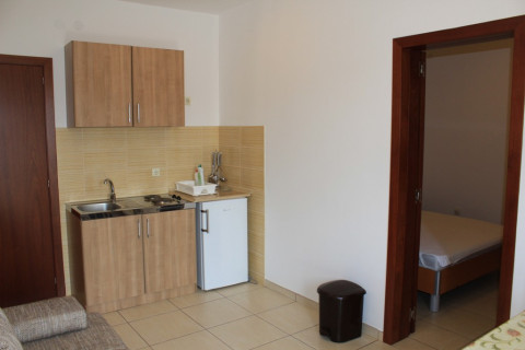 В APP 06/ DOLINA SUNCA, 2 BR: трикімнатний номер, у вітальні розкладний диван, повністю обладнана кухня, їдальня зона, в одній спальнe французьке ліжко, в іншій дві роздільні, кондиціонер, супутникове ТБ, Wi Fi інтернет, санвузол з душовою кабіною, дві тераси з видом на сад. Площа: 50 м2. Макс розміщення: 5 дор.