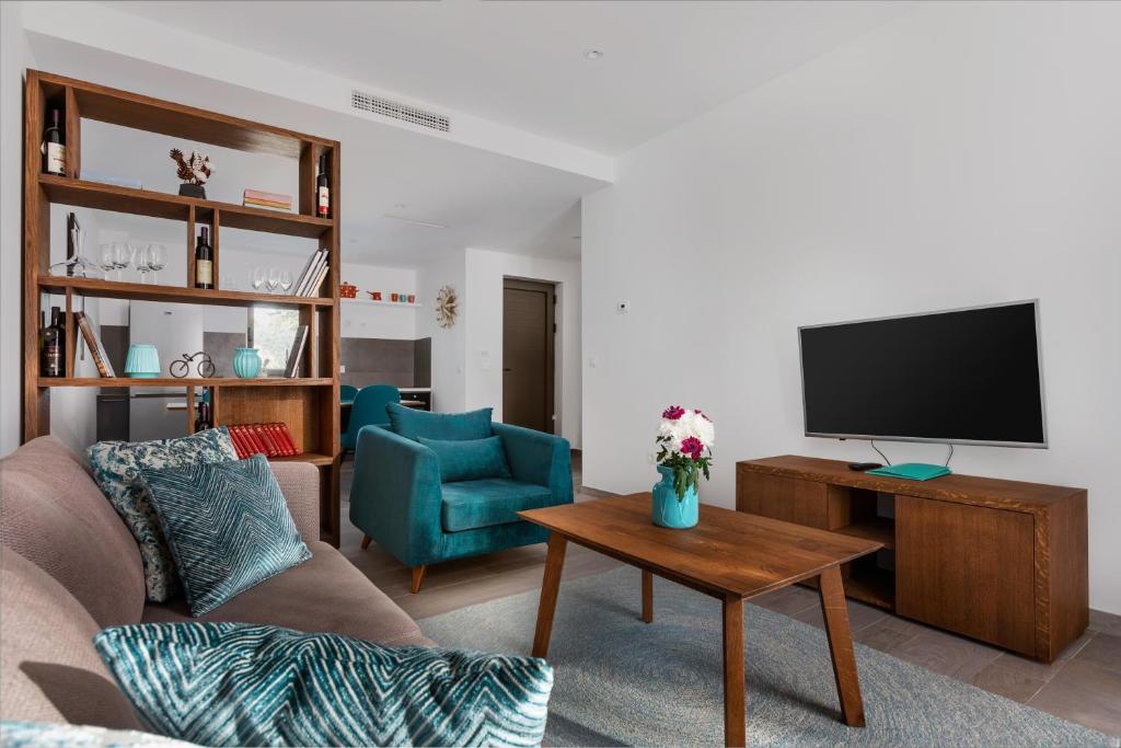 В АРР 1 BR: вітальня з розкладним диваном, повністю обладнана кухня, у спальні французьке ліжко, номер розташований на першому поверсі готелю, тераса з прямим виходом до басейну. Площа: 50 м2. Максимальне розміщення: 3 особи.
