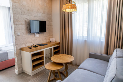 B Family room: зонований номер, у вітальні диван, що розкладається, в спальні французьке ліжко або роздільні ліжка, кондиціонер, супутникове ТБ, Wi Fi інтернет, сейф, міні бар, чайник, санвузол з душовою кабіною, фен, балкон. Максимальне розміщення: 2 дор. + 2 дит. Площа: 30 м2.